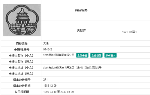 天坛图形商标的所有人北京星海钢琴集团有限公司,对“天坛拾光”商标提出了商标的异议申请。经过审查,商标局最终驳回了“天坛拾光”商标所指定的部分商品。