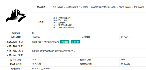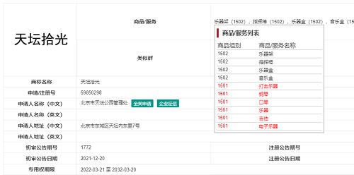 天坛的图形商标,与“天坛拾光”商标的注册申请,双方所指定的商品有部分近似。在商标申请的实质审查阶段,“天坛拾光”商标所指定的所有商品均初审公告了。