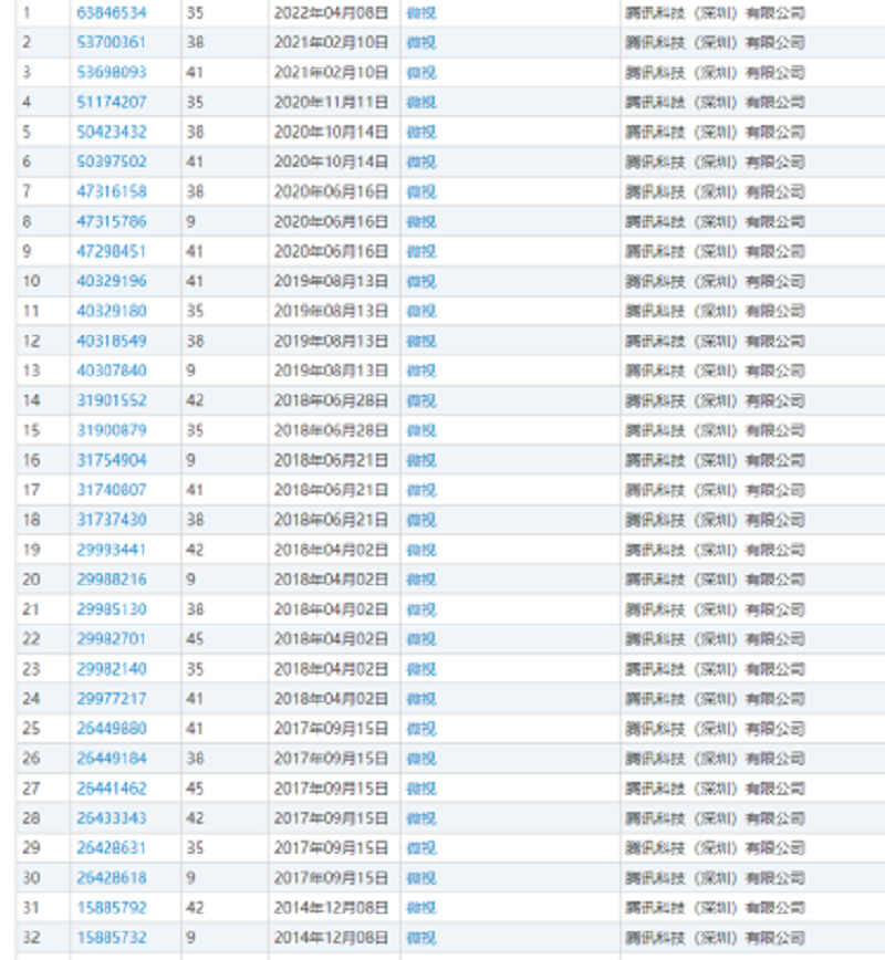 在这个短视频炙手可热的年代,腾讯一直想把微视扶植起来,虽然经历了外界诸多猜疑,导致现在微视不温不火,但是既然是自家产品,腾讯肯定要好好保护,迄今为止,腾讯申请了多件“微视”商标和“腾讯微视”商标,这些商标中包含文字商标和图形商标。